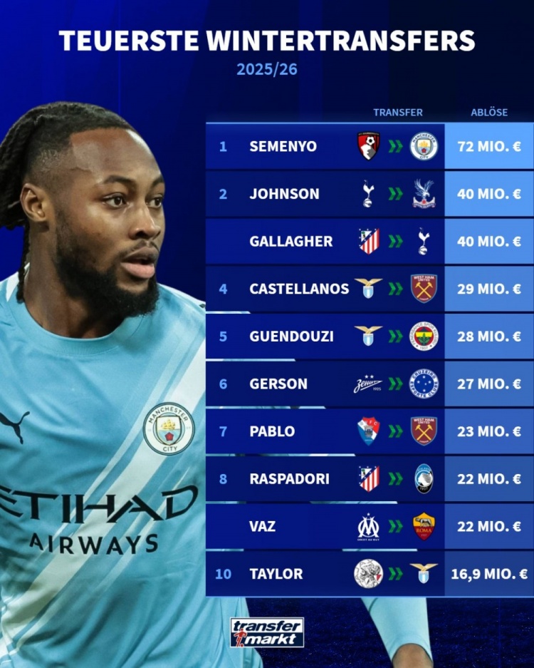 1月17日讯 2025-26赛季冬季转会窗已经开启大约半个月时间,德国转会市场盘点了球员的转会费情况,塞梅尼奥7200万欧最高,布伦南·约翰逊和加拉格尔均4000万欧并列次席。