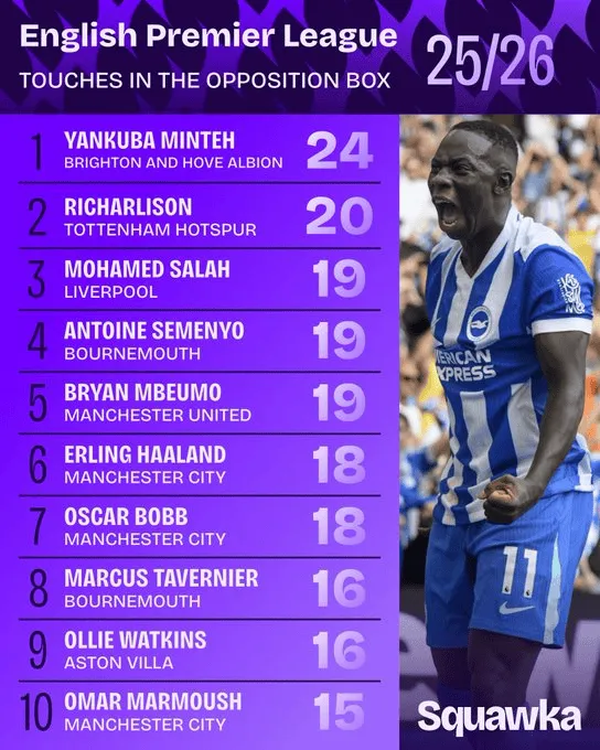 虎扑09月03日讯 Squawka网站统计了2025/26赛季英超前三轮比赛中,各队进攻球员在对方禁区内触球次数。